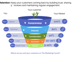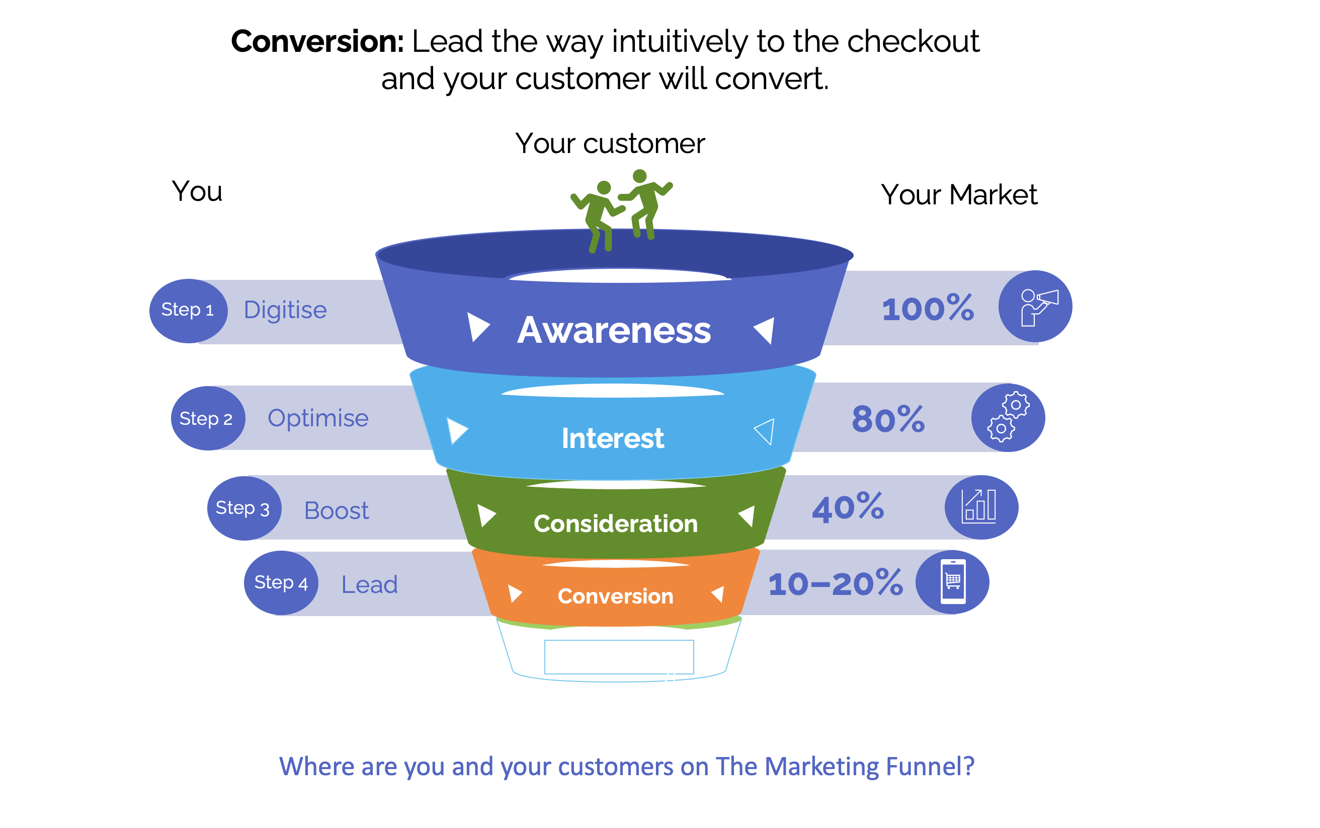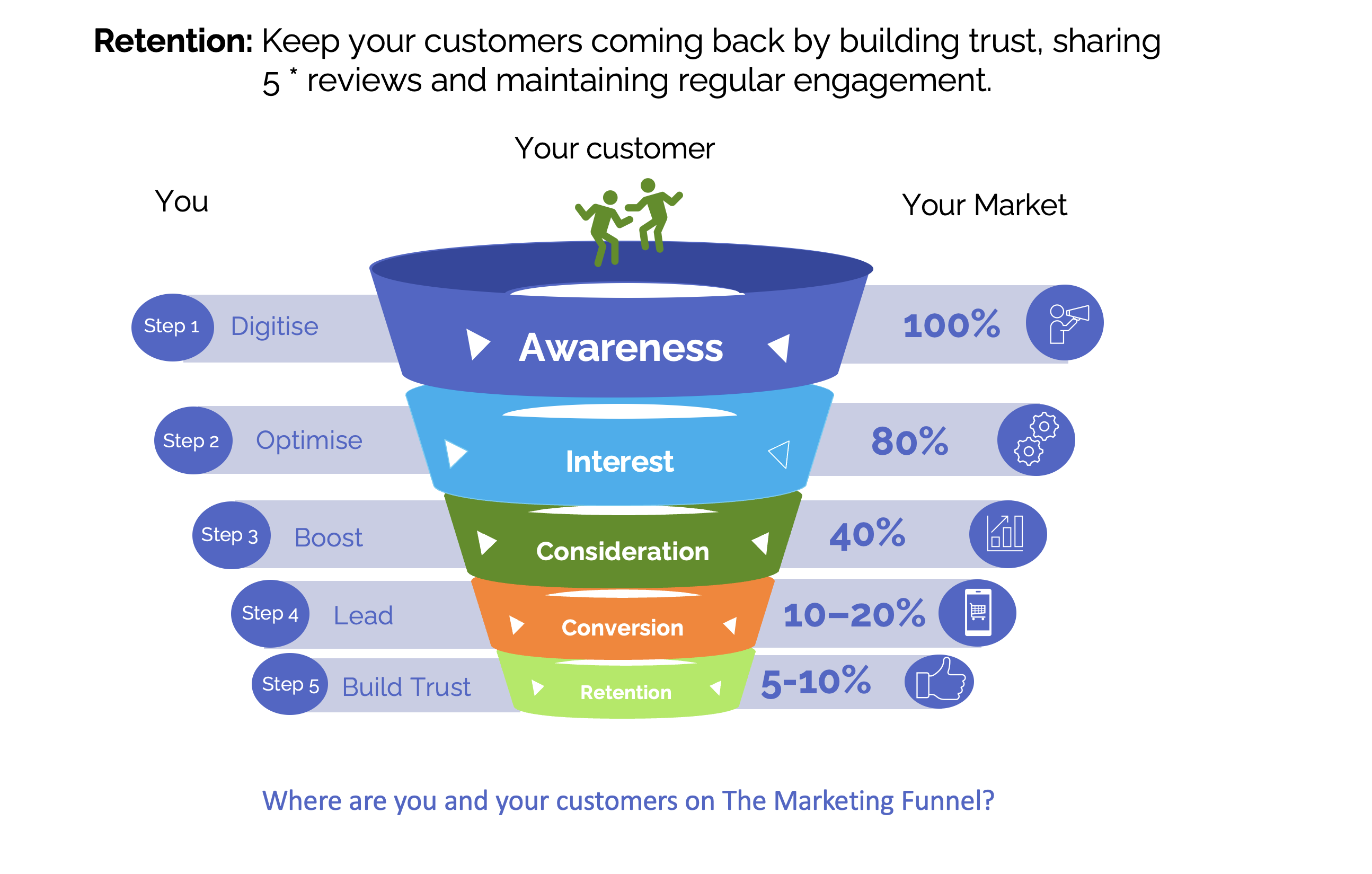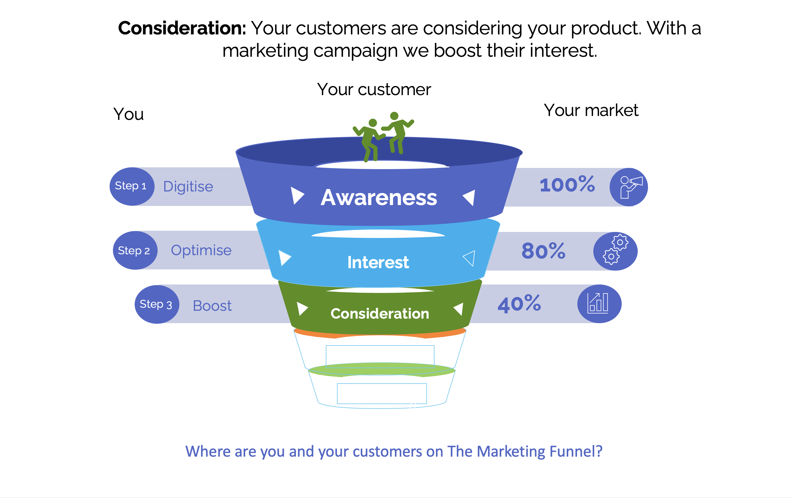 Each Revcurv step takes you and your customers further through The Marketing Funnel.